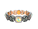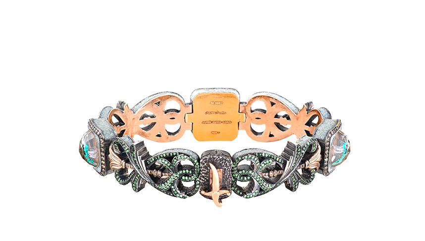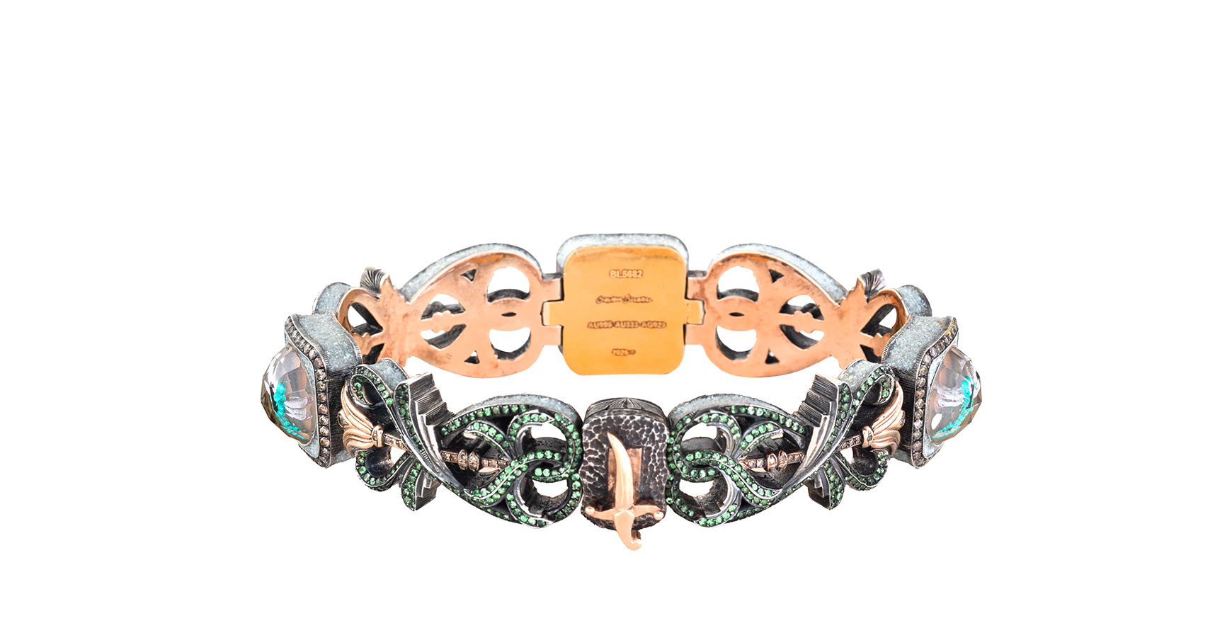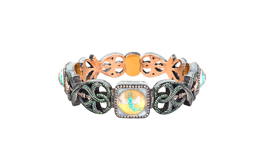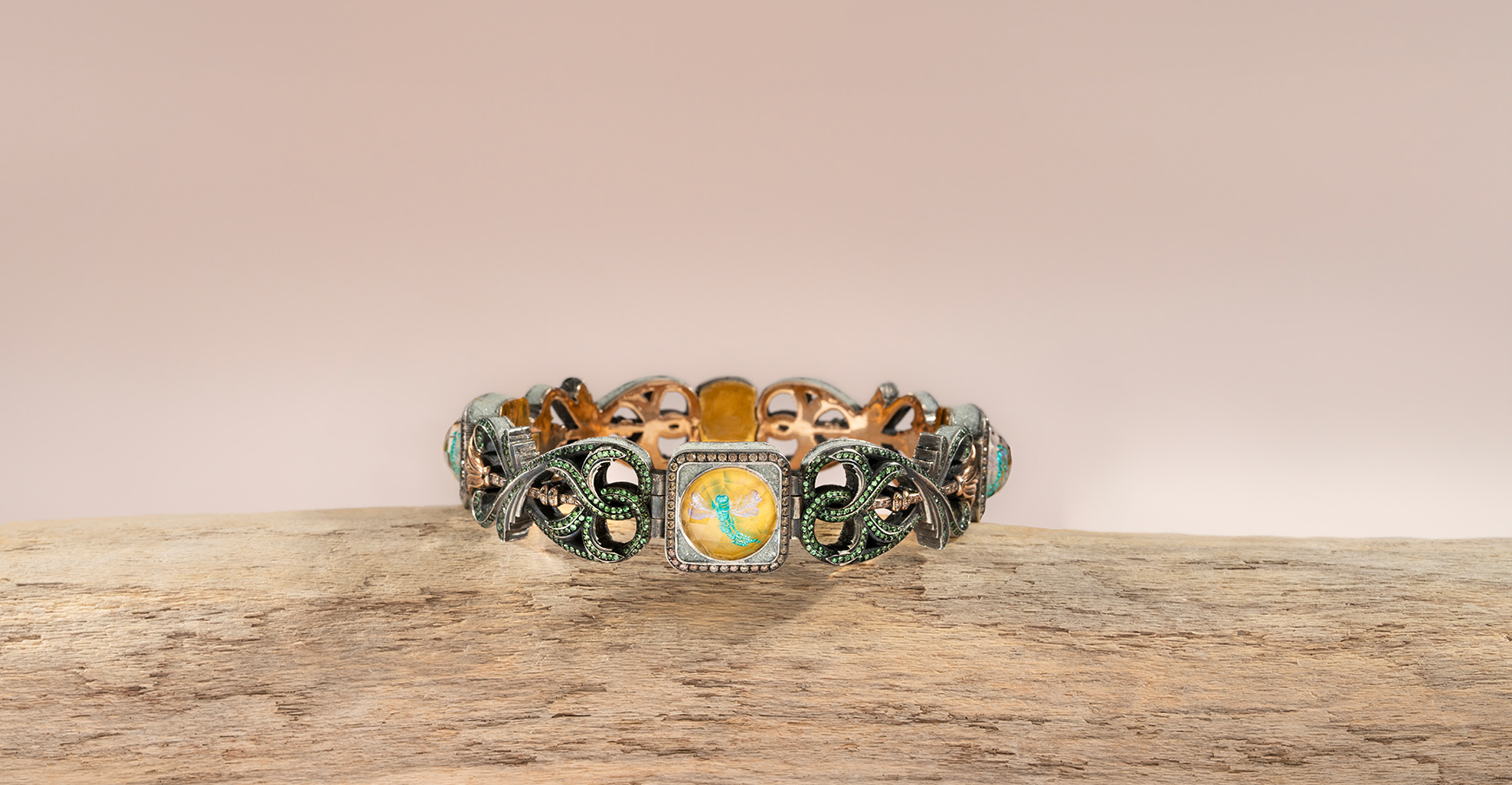 Bracelet of gold, silver, diamonds, green garnet, and rock quartz featuring dragonflies engraved in reverse intaglio on three separate stones.