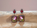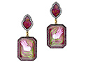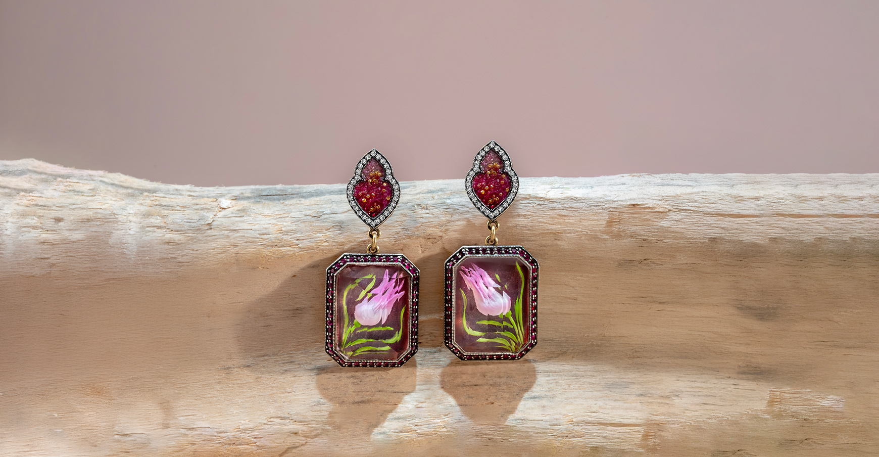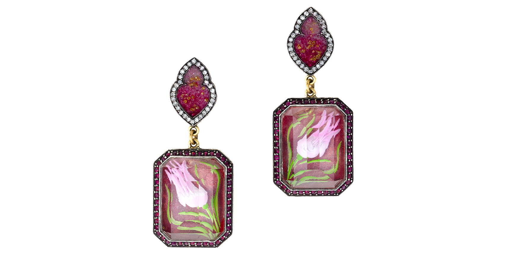 Earrings of gold, silver, diamonds, rubies, and rock crystal, featuring a tulip motif engraved within the crystal using the reverse intaglio technique, completed with a mosaic of garnet and yellow diamonds.