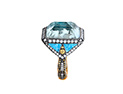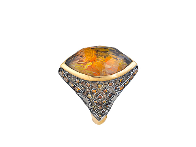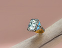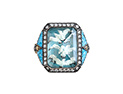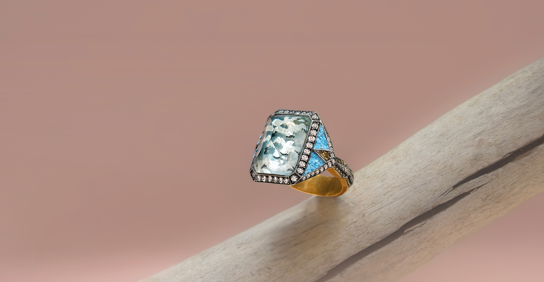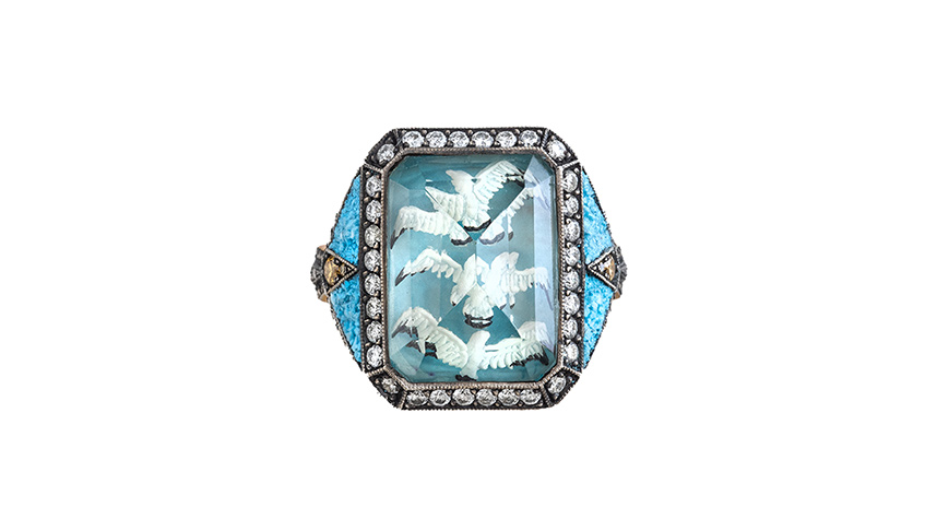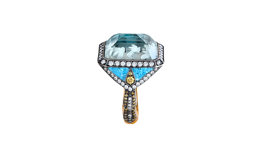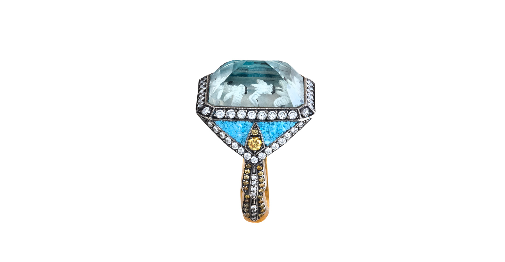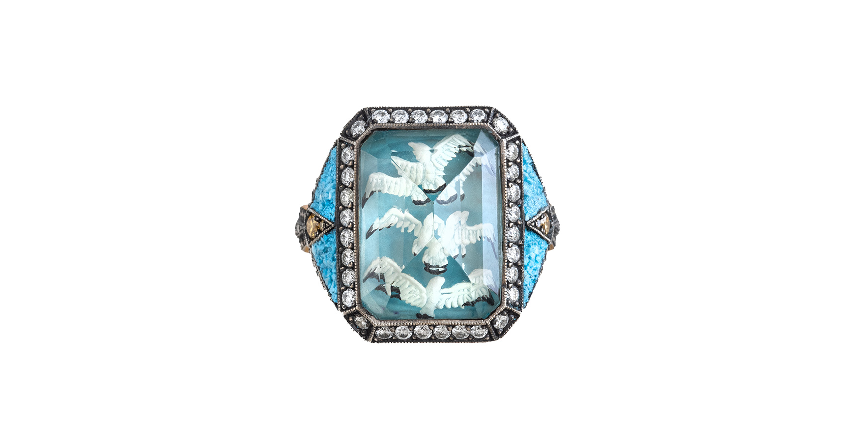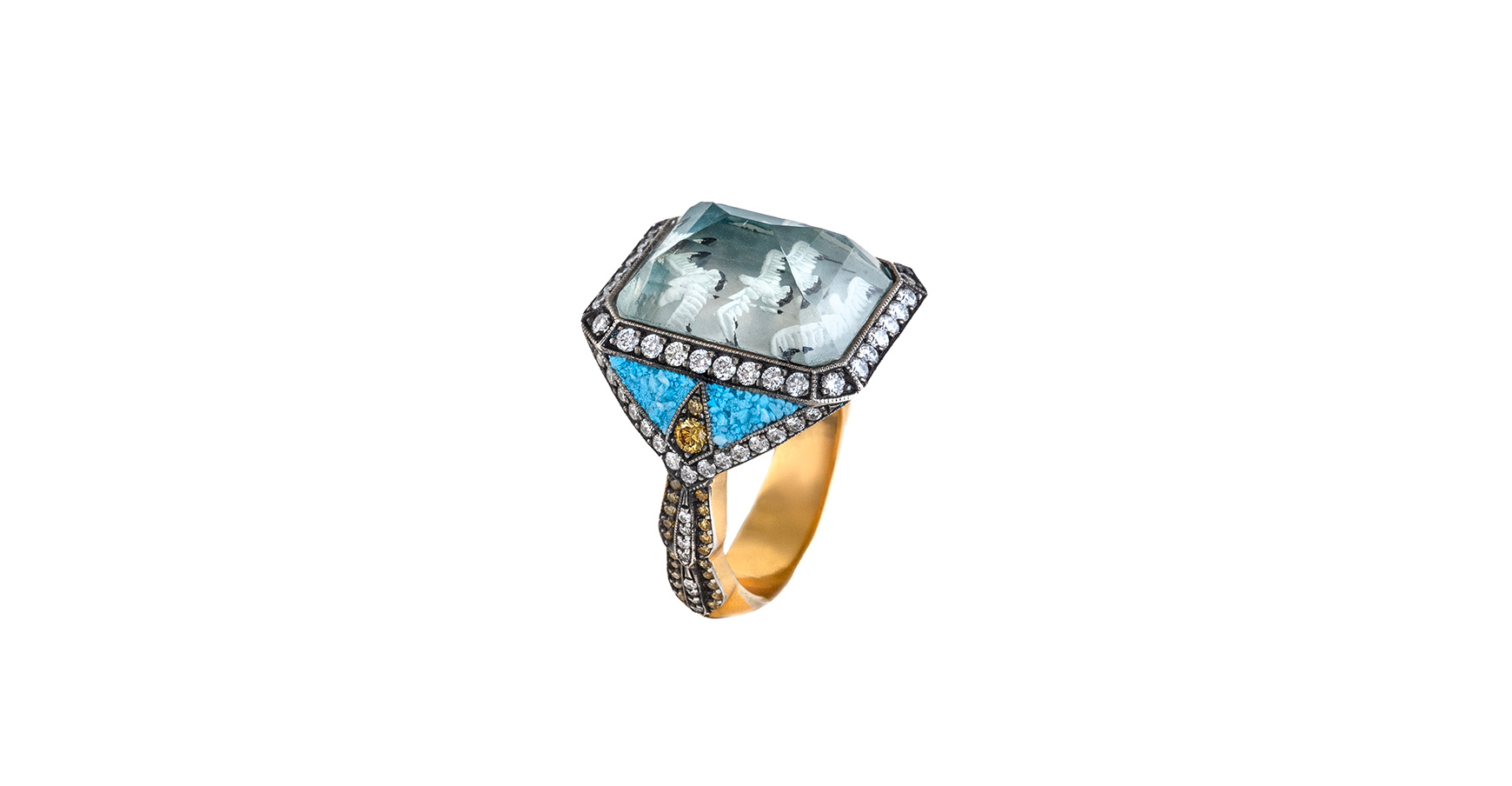 Ring of gold, silver, diamonds, turquoise mosaics, and rock crystal featuring seagull figures engraved within using the reverse intaglio technique.
