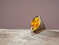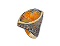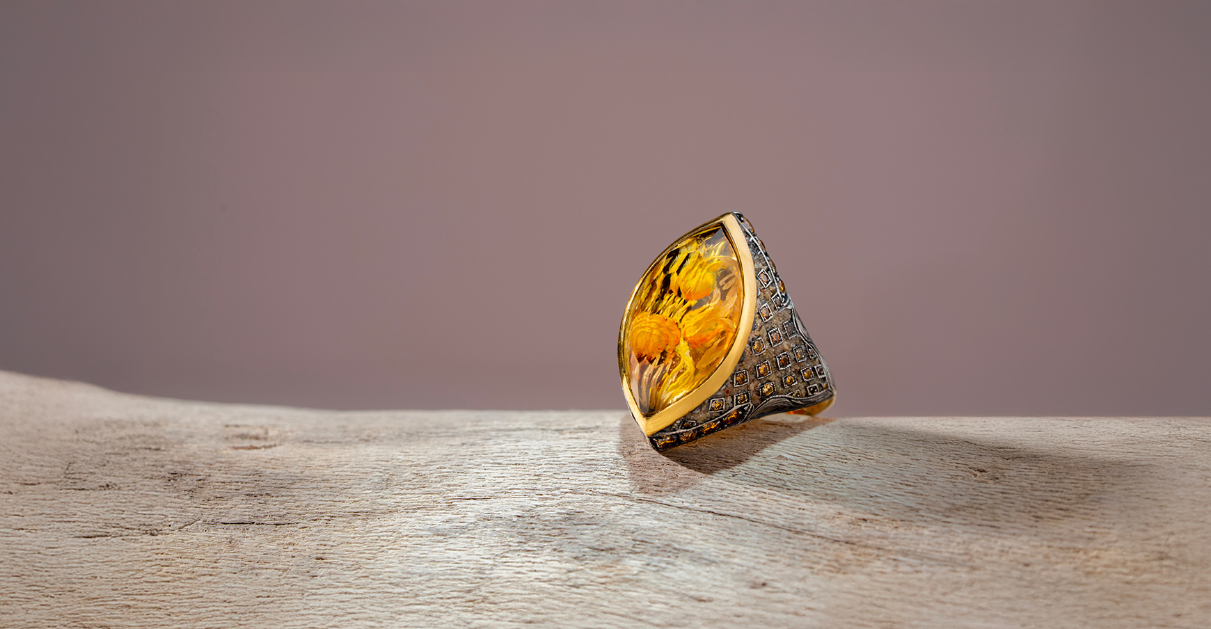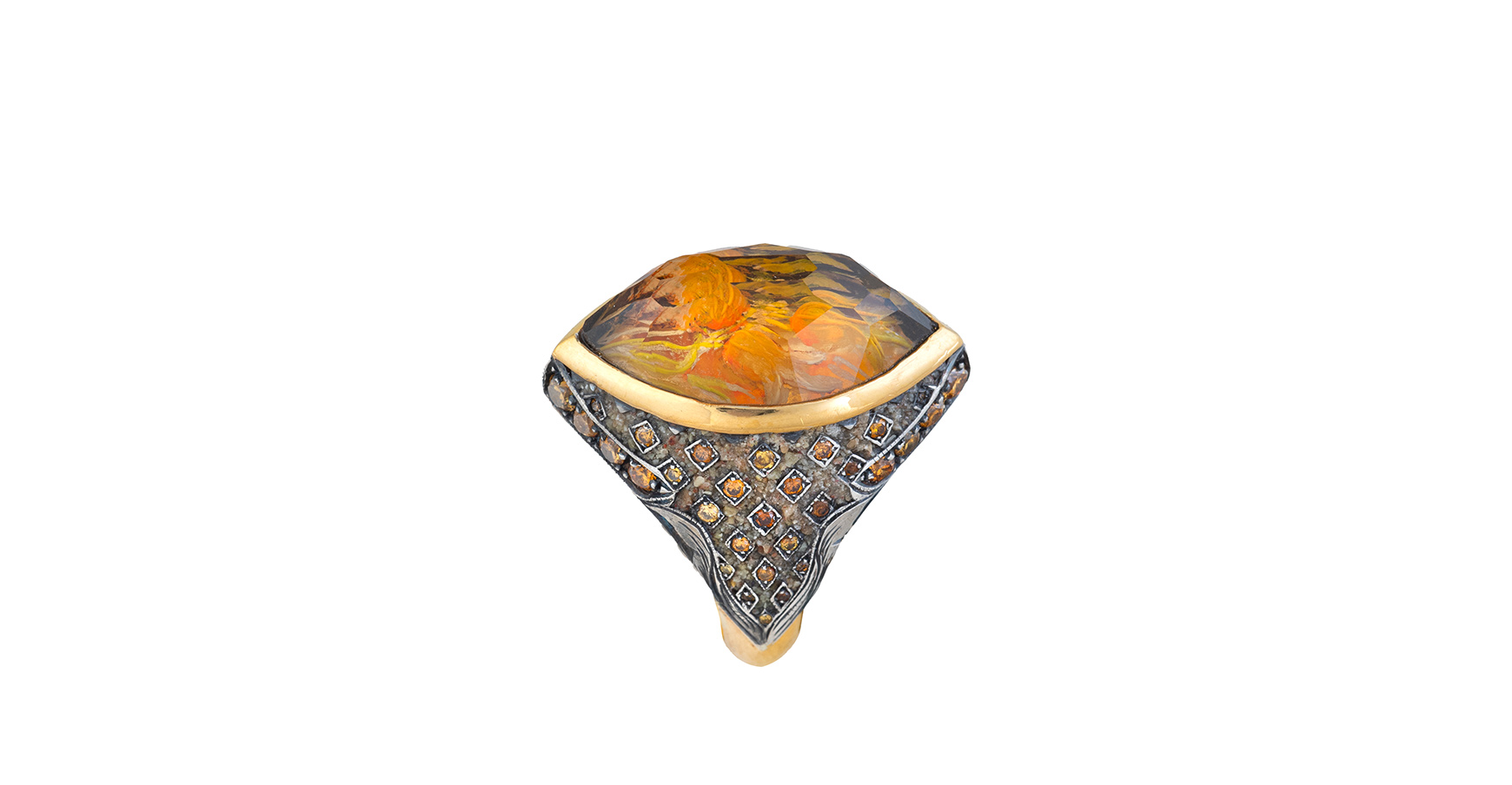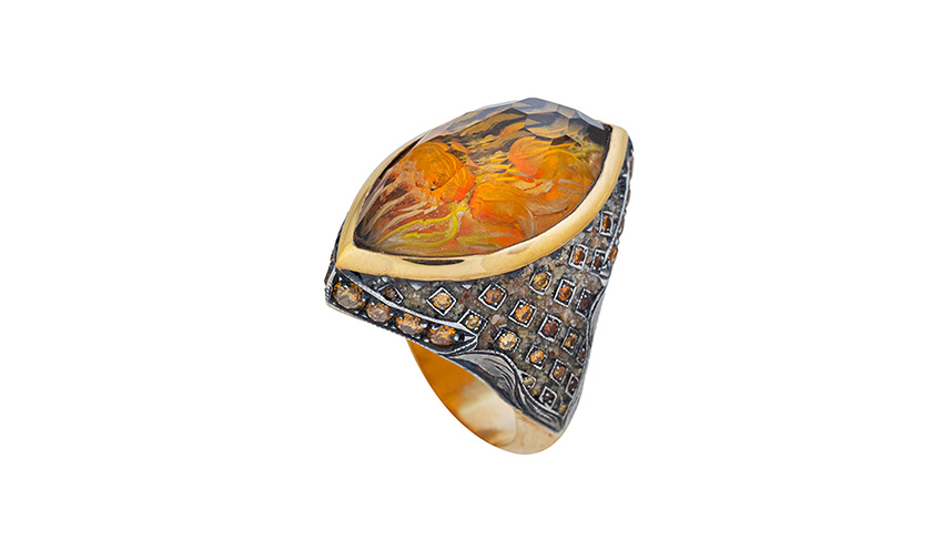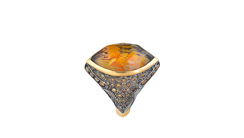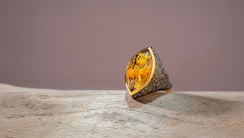 Ring of gold, silver, diamonds and citrine, featuring tulip motifs engraved within using the reverse intaglio technique.